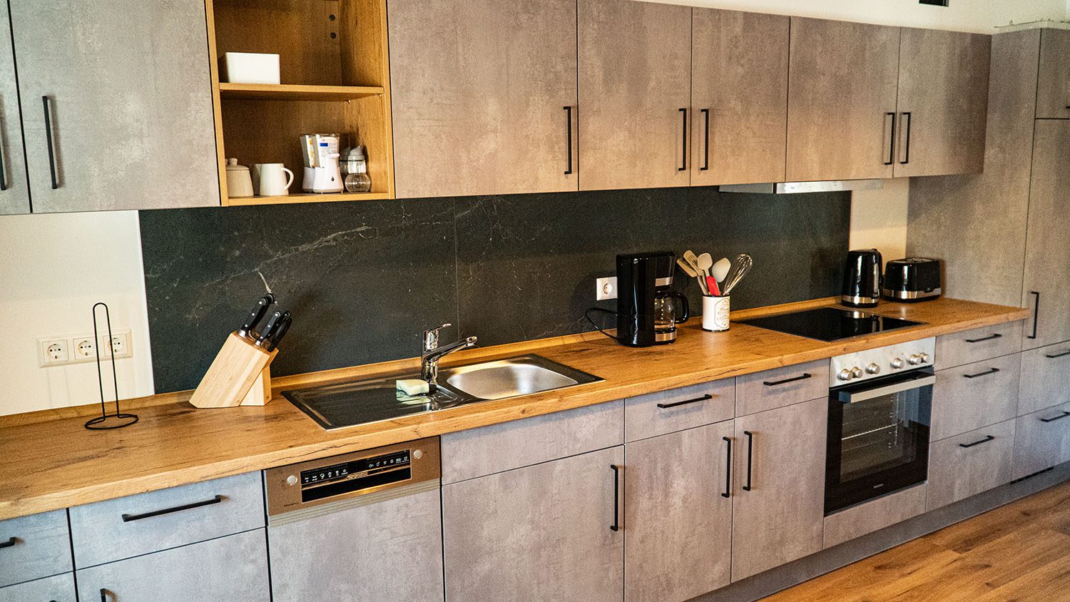 Voll ausgestattete Küche mit Ceranfeld, Backofen, Spülmaschine, Kühlschrank, Kaffeemaschine, Wasserkocher und eine kleine Teeauswahl. Zudem ist die Küchenzeile rollstuhlgerecht gestaltet.