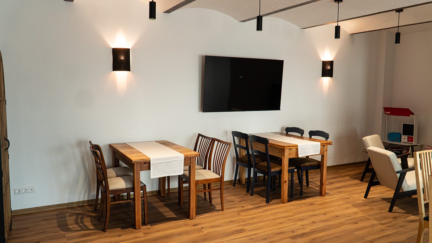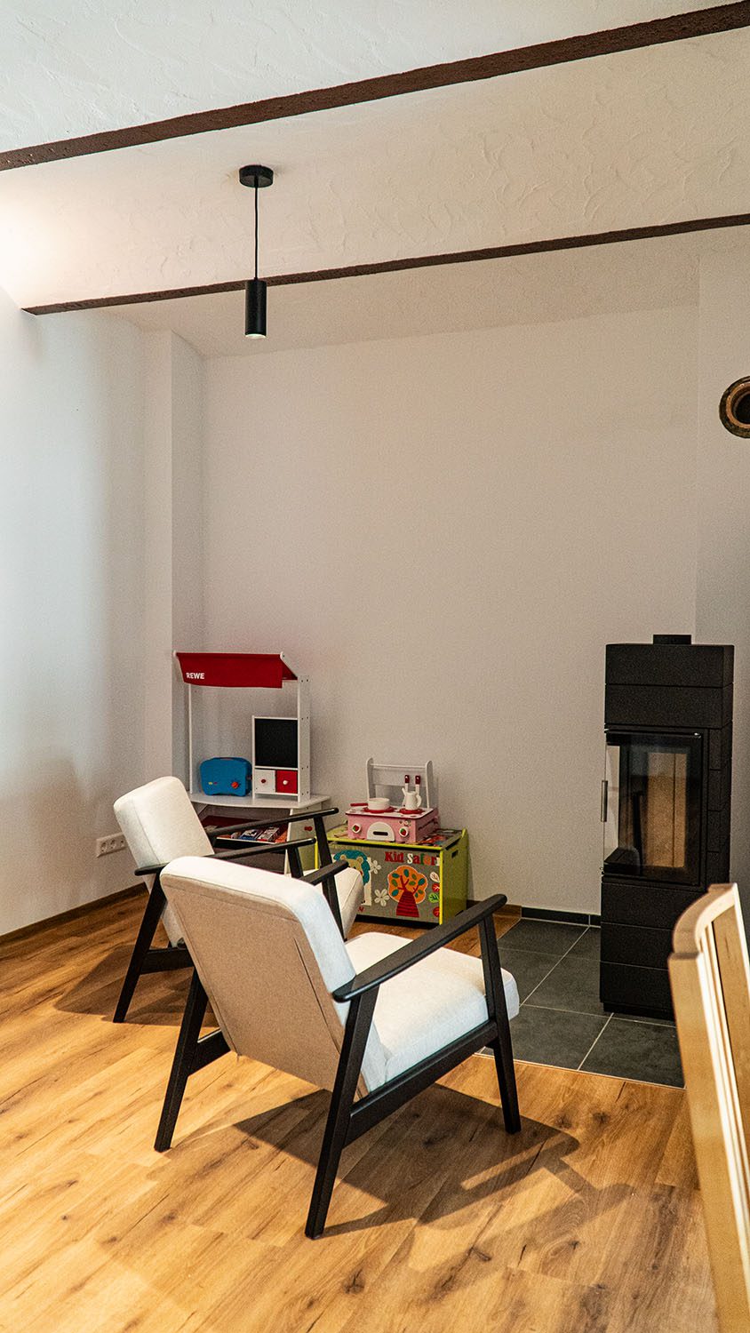 Auf ca. 44 m² erwartet dich ein heller, gemütlicher Raum mit Platz für bis zu 20 Personen. Der warme Kaminofen schafft eine wohnliche Atmosphäre, die zum Verweilen, Austauschen und Feiern einlädt – zu jeder Jahreszeit.